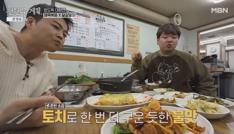 이곳의 대표 메뉴인 '김치두루찌개+제육직화+계란말이' 세트를 주문했습니다. 불향이 입혀진 제육직화 구이에 감동한 두 분은 정신 없이 식사에 몰두했습니다.