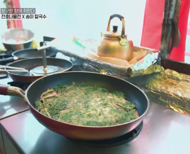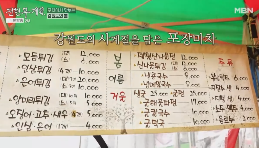 지칠 때쯤 나타나는 천막 하나 강원도의 사계절을 담은 포장마차 산나물 튀김에 이어 전과 송이칼국수를 맛봅니다.