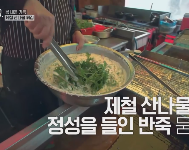 제철 산나물에 정성을 들인 반죽 뭍혀 끓는 기름에 바로 입욕 즉석에서 튀겨주는 산나물 튀김입니다.