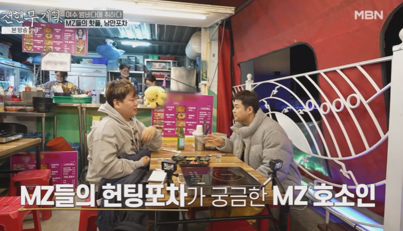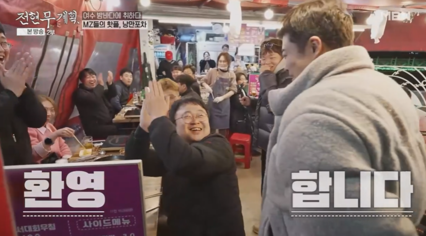 해가 지고 달이 뜨면 여수의 낭만이 시작되는 밤바다 MZ들의 핫플 낭만포차 전현무와 곽준빈이 포차에 들어서자 뜨거운 환호가 이어집니다.