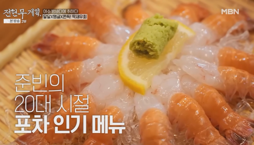 딱새우회는 준빈의 20대 시절 포차 인기 메뉴 였다고 합니다. 딱새우 꼬리를 딱 잡고 간장이나 초장에 찍어서 드시면 됩니다.
