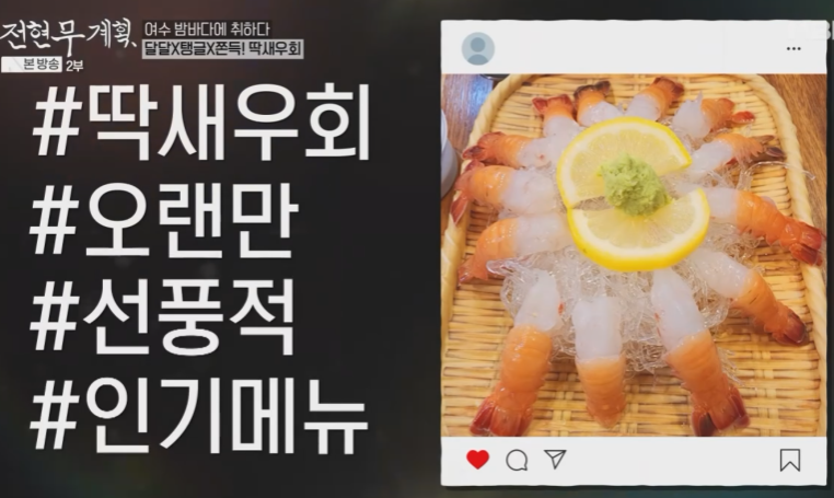 딱새우회는 준빈의 20대 시절 포차 인기 메뉴 였다고 합니다. 딱새우 꼬리를 딱 잡고 간장이나 초장에 찍어서 드시면 됩니다.