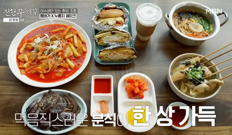 햄버거 집에서 떡볶이 국수 순대 등 먹음직스러운 분식이 한상 가득