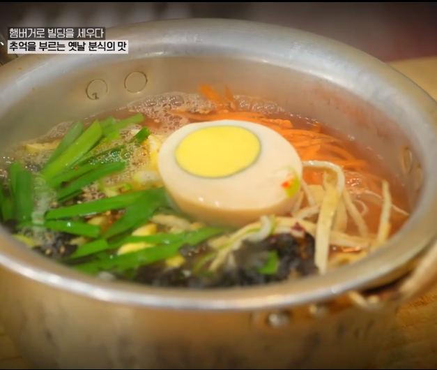 햄버거 집에서 떡볶이 국수 순대 등 먹음직스러운 분식이 한상 가득
