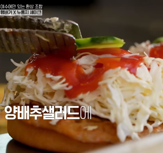 부와 맛을 가져온 소고기와야채 패티는 직접 굽고 빵은 겉만 살짝구워서 곱게 구워진 패티와 햄 양상추와 오이 옛날 감성 그대로 햄버거를 만듭니다.