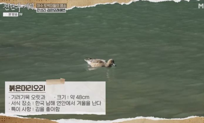 바닷물 위에 떠다니는 오리 '붉은머리오리'는 한국 남해 연안에서 겨울을 나며 김을 좋아한다고 합니다.