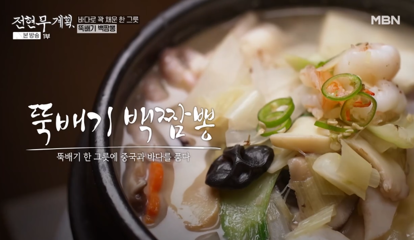 바다로 꽉 채운 한 그릇 뚝배기 백짬뽕은 직접 뽑은 면에 각종 채소와 해산물은 뽑아서 산동요리 특유의 물을 넣어서 담백하게 만듭니다.