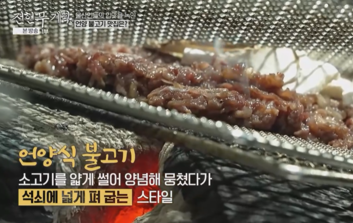 언양식 불고기는 소고기를 얇게 썰어 양념해 뭉쳤다가 석쇠에 넓게 펴 굽는 스타일입니다.