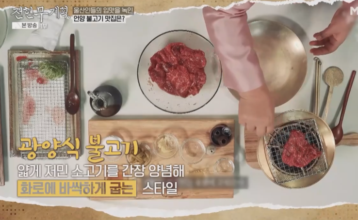 광양식 불고기는 얇게 저민 소고기를 간장 양념해 화로에 바싹하게 굽는 스타일입니다.