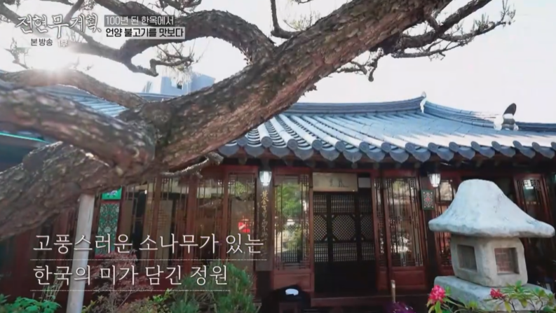 고풍스러운 소나무가 있는 한국의 미가 담긴 정원 100년 된 한옥에서 40년 식당을 운영하고 있습니다.