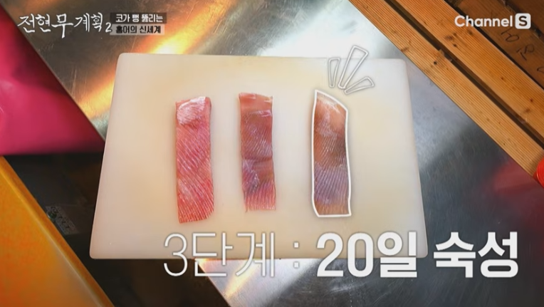 이어 1단계 (1주일 숙성) 홍어는 담백하고 부드러운 맛이 강조되었고,