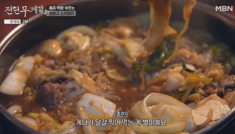 얇게 썬 아와규와 싱싱한 채소를 간장 베이스 양념에 졸여 먹는 일본식 전골 요리입니다.