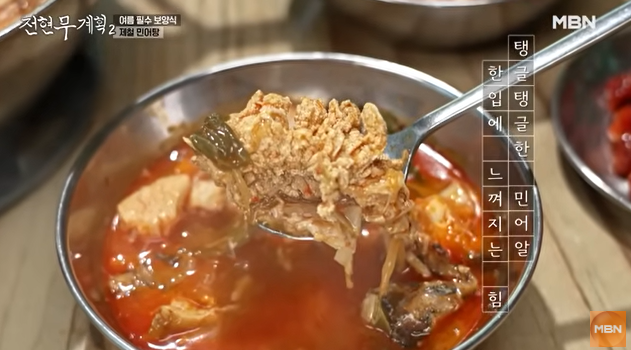 빨갛고 칼칼한 국물에 두툼한 민어 살점이 듬뿍 들어가 있어 한 숟갈 뜨는 순간 입안 가득 감칠맛이 퍼집니다.