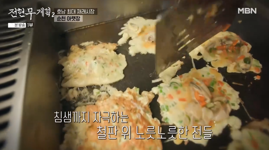 전현무와 곽튜브, 권은비는 아랫장의 노포 전집에서 다양한 '바다 밥상' 전 요리를 맛보았습니다. 특히 칠게튀김, 명태 대가리전, 맛조개전 등 싱싱한 해산물로 만든 전 요리가 소개되었습니다.