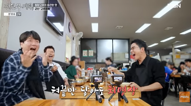 전현무는 “매운데 맛있어, 입에서 단내가 나는데 계속 먹게 돼요”라며 감탄합니다.