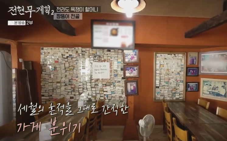 56년의 세월이 고스란히 묻어있는 가게 내부는 정겨운 시골 분위기를 자아냅니다. 벽에는 메뉴판 대신 손님들이 남긴 수많은 명함이 붙어있어, 이곳을 찾은 사람들의 추억을 느낄 수 있습니다.