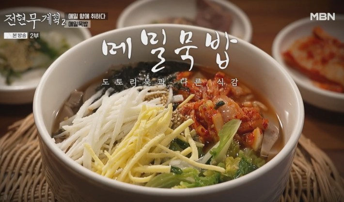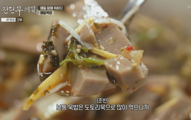 도토리묵과는 다른 식감을 자랑하는 메밀묵밥도 이곳의 인기 메뉴 중 하나입니다. 쫄깃하면서도 부드러운 메밀묵의 식감과 함께 다양한 채소가 어우러져 건강한 한 끼를 즐길 수 있습니다.