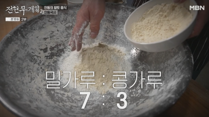 안동국시의 비결은 밀가루와 콩가루의 특별한 배합에 있습니다. 밀가루 7, 콩가루 3의 비율로 반죽하여 더욱 부드러운 식감을 자랑합니다. 콩가루가 만들어내는 보들보들한 식감은 안동국시만의 특징이라고 할 수 있죠.