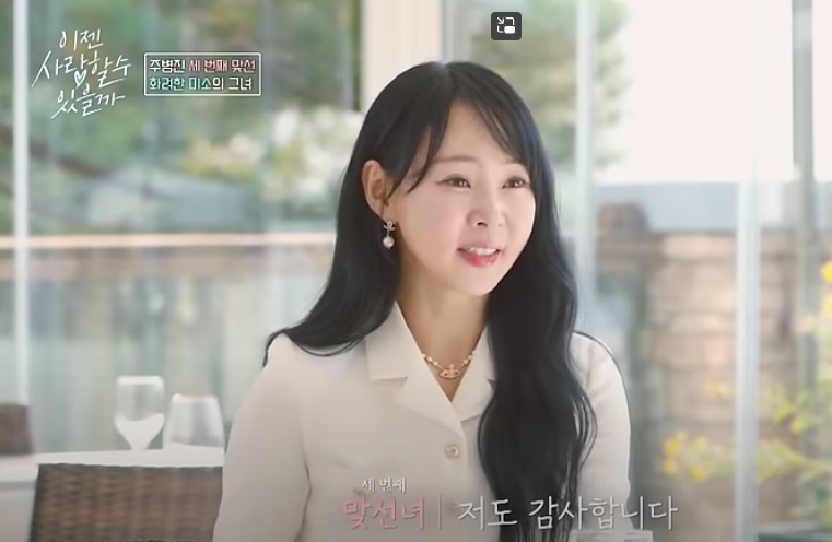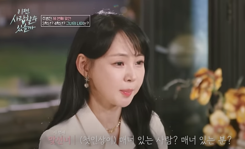 '이젠 사랑할 수 있을까' 주병진의 세 번째 맞선 상대의 정체가 공개되었습니다. 앞서 주병진은 화가 최지인, 호주 교포 출신의 변호사 신혜선과 총 2번의 맞선을 진행했지만, 결국 주병진은 애프터 신청을 하지 않고, 마지막 맞선까지 선택했습니다.