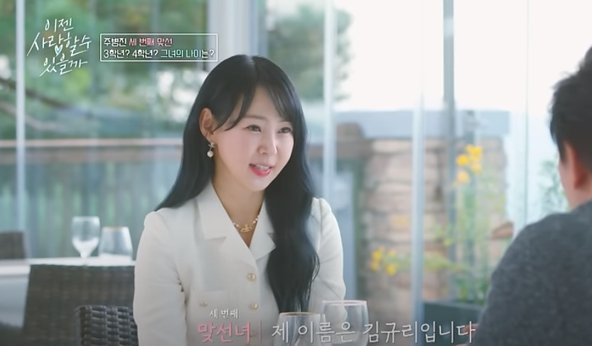 세 번째 맞선에서는 골프를 좋아하는 두 사람을 위해 골프장 맞선이 진행되었습니다. 주병진의 세 번째 맞선 상대는 대구에서 온 1970년생 김규리 이고, 현재 수산물 도매업을 하고 있다"라고 소개되었지만 실상 도매업 보다는 인스타에서 콩국 판매로 본인을 외부에 알려야 하는 홍보직업이 가깝다고 합니다.