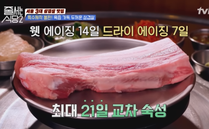 두꺼운 고기를 부드럽게 하는 이 집만의 비밀은 21일 숙성 웻 에이징 14일 삼겹살의 촉촉하고 부드러운 식감은 높입니다.