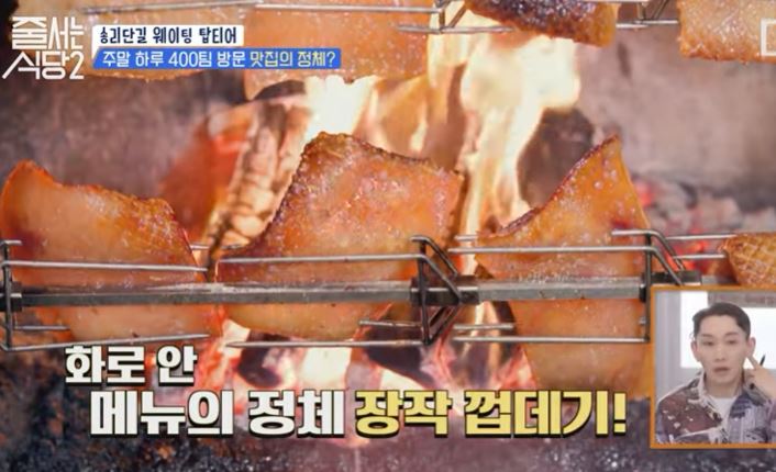 시작부터 웨이팅이 116팀이 있습니다. 기다리고 계시는 손님은 2시간에서 4시간 까지 대기하고있습니다. 대기중 보이는 전기구이 통닭을 굽는 화로에 돼지껍데기가 돌아가고 있습니다.