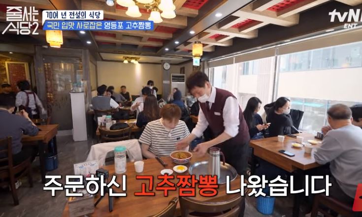 70년 동안 영등포에서 짬뽕으로 일등한 중국집입니다. 손님들이 다양하게 음식을 먹고 있는데 그중에서도 고추짬뽕이 70여년가 이어온 메뉴입니다.