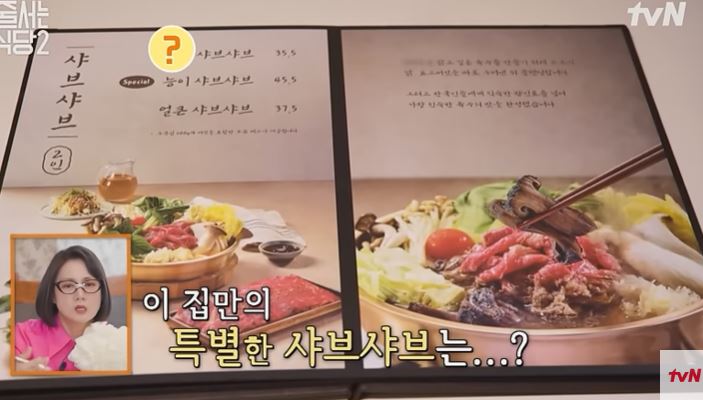 이 집만의 특별한 샤부샤부 시그니처 메뉴 '방아 샤브샤브'와 곤드레죽, 미나리 육전 튀김을 주문합니다.
