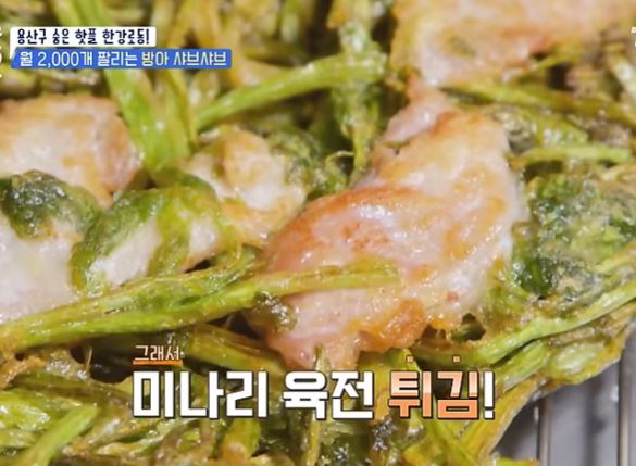 통미나리에 돼지목심, 밀가루반죽을 하고 프라이팬에 구웟 90초 튀겨내는 '미나리육전튀김'입니다.