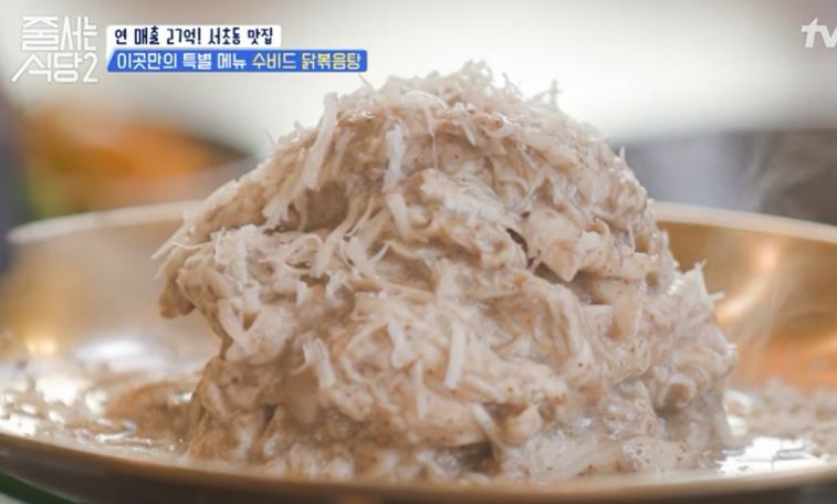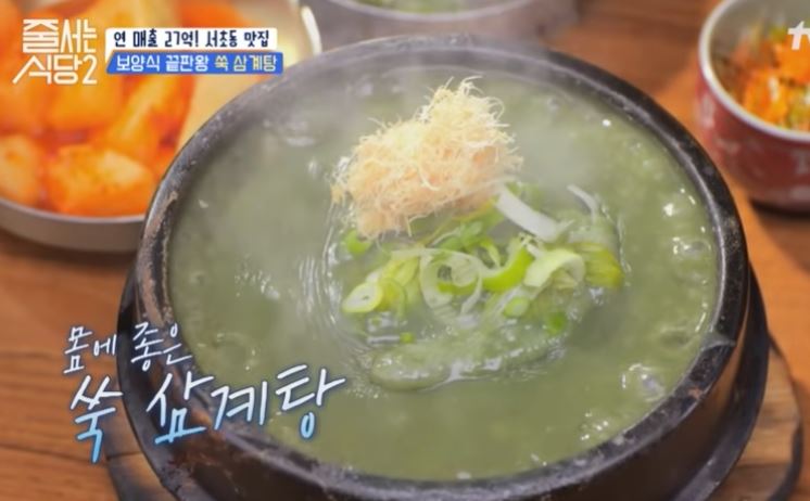 줄서는 식당 2, 연매출 27억 서초동 맛집 하루 2,000마리 팔리는 '쑥 삼계탕' '수비드 닭볶음탕' 보양식 끝판왕 쑥 삼계탕은 산삼 배양근이 듬뿍 올려져 있습니다.