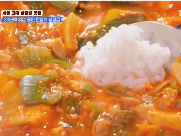 냉삼과 김치 파절이를 함께 먹으면 누구나 좋아하는 환상의 조합입니다. 마지막으로 청국장의 깊은 맛이 고기의 느끼한 맛을 싹 가셔줍니다.