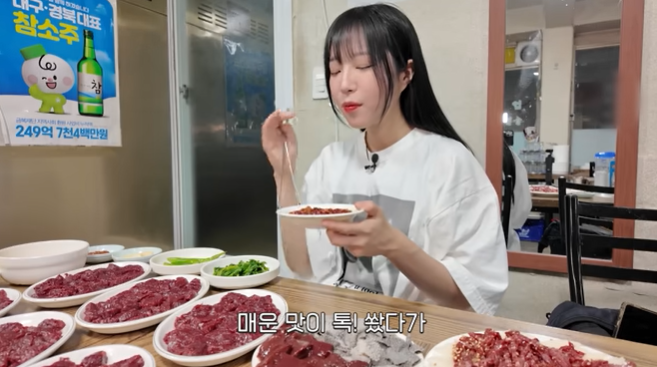쯔양은 뭉티기를 접시에 붙여도 떨어지지 않는 모습을 보여주며, 그만큼 신선도가 뛰어나다고 강조했어요. 육질이 살아있는 뭉티기의 매력을 제대로 느낄 수 있습니다.