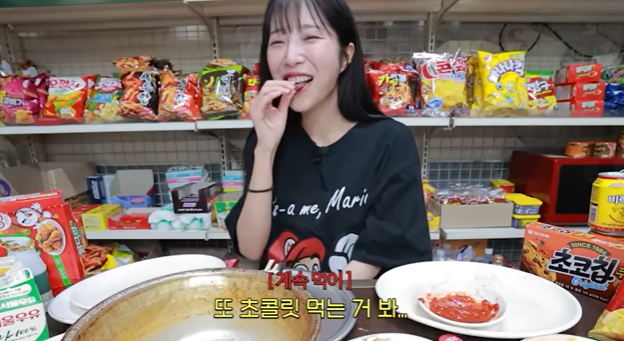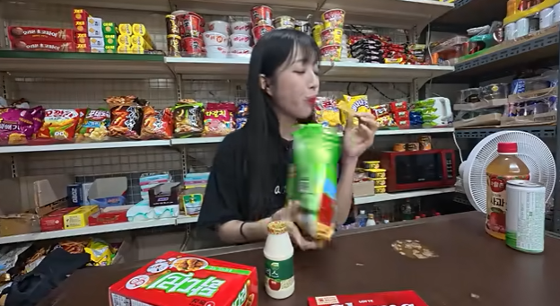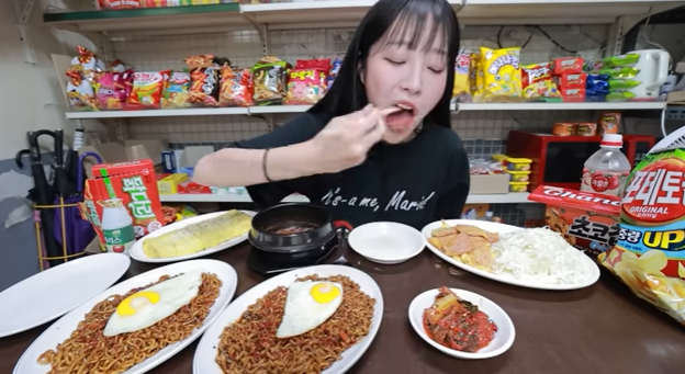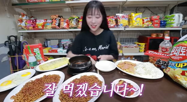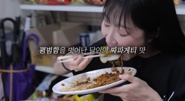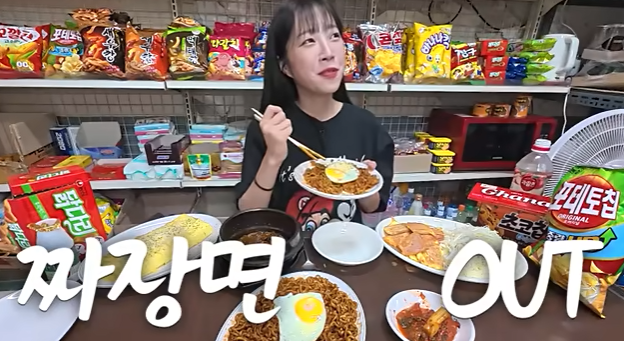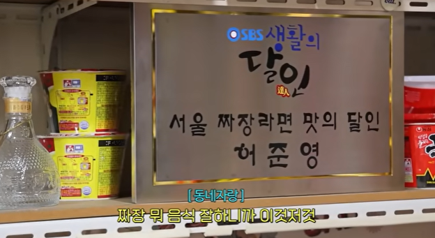 진행자는 이곳에서 가장 인기 있는 메뉴인 짜파게티에 겨자잎 김치를 곁들여 먹고,