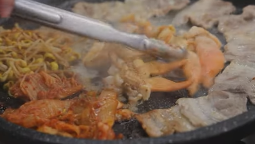 - 삼겹살이 적당히 익으면 그 위에 갈미조개를 올려 구워 함께 먹는 구조.