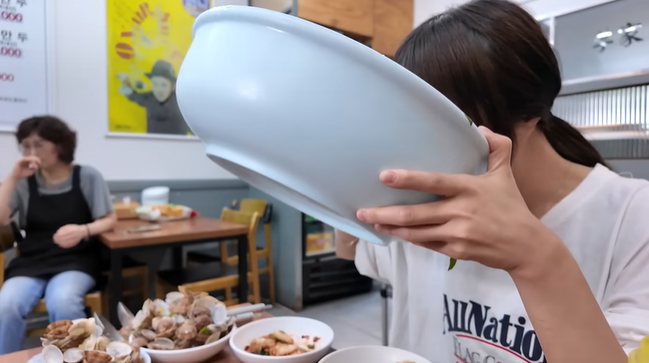 쯔양은 등장부터 엄청난 크기의 그릇을 보고 놀랍니다.
