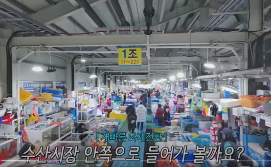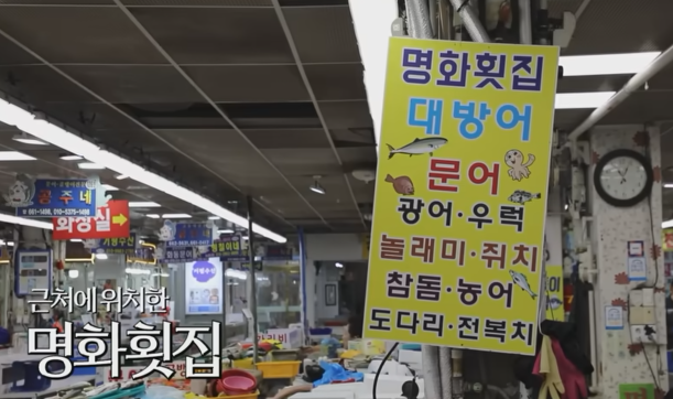 시장에서 자연산 회를 구입하고 명화횟집에서 먹방을 가집니다.