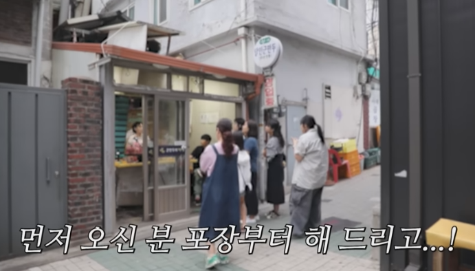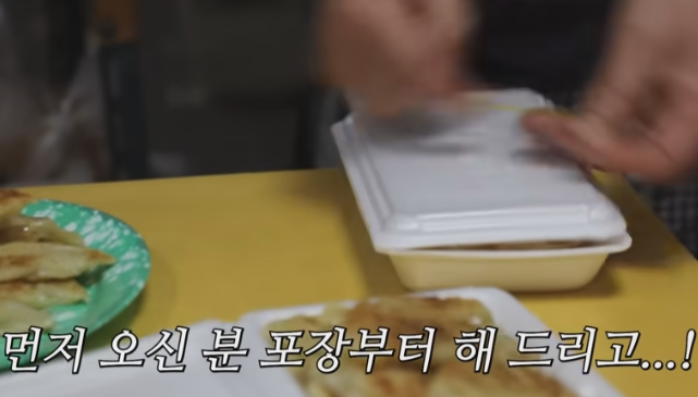 만두를 진짜 잘 굽는 사장님에게 칭찬을 아끼지 않으며, 집에서도 먹을 만두를 다시 포장해 가기로 합니다.