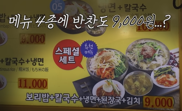 가성비 좋은 메뉴들 메뉴는 칼국수와 냉면이 각각 9,000원 보리밥, 칼국수, 냉면, 된장국, 김치가 포함된 세트도 9,000원으로 가성비가 뛰어납니다.