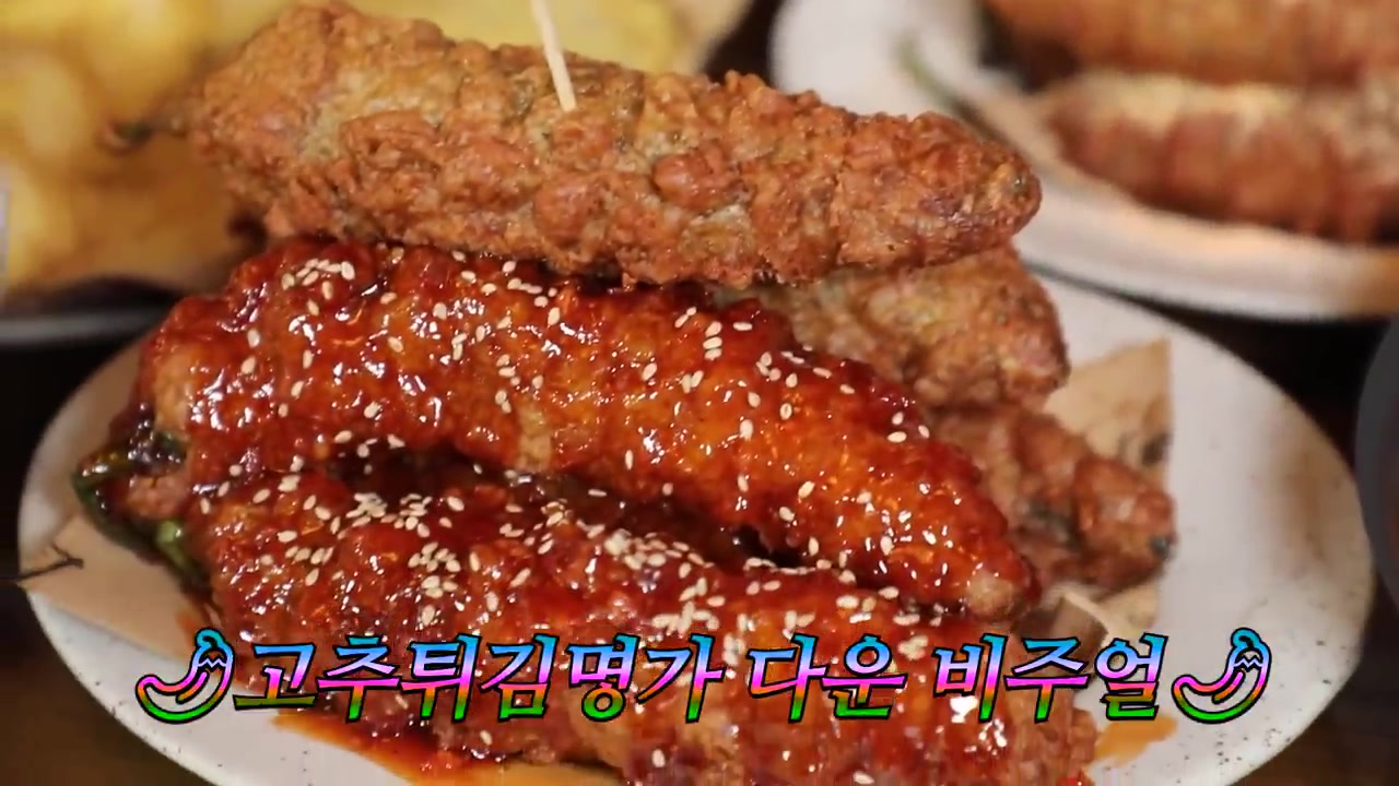 망원시장에서 즐기는 대왕 고추튀김과 다양한 안주, 막걸리 즐기기! 고추튀김의 크기와 맛을 느끼며 망원시장의 붐비는 분위기 속에서 다양한 안주를 맛보고 막걸리 한 잔 즐기는 모습을 소개합니다.