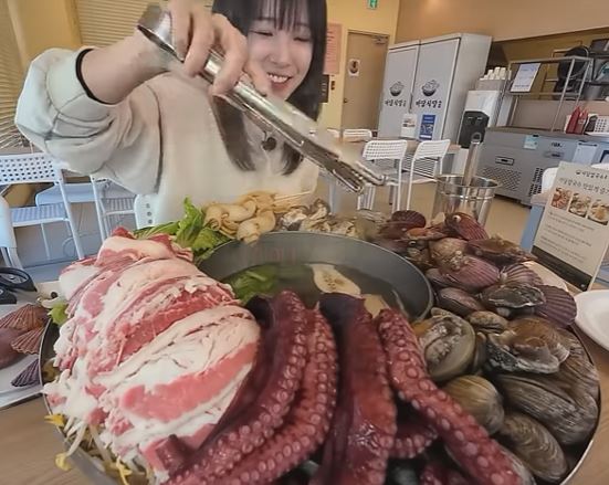 다양한 해산물을 즐기며 문어, 고구마, 우삼겹, 홍합 등의 맛을 즐깁니다.