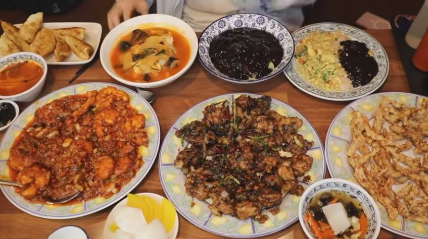 짬뽕, 짜장면, 탕수육, 군만두 등이 차례로 등장하며 맛있게 먹습니다.