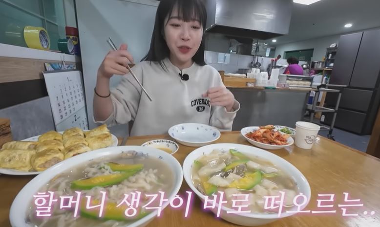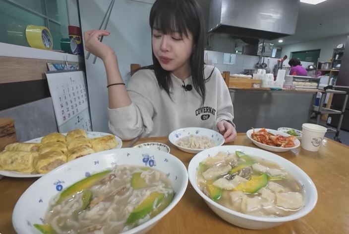 겨자소스와 나오고 쯔양은 그릇이 마음에 들었다고 하며 나온 음식의 국물 먼저 맛봅니다. 집에서 찐으로 할머니가 끓여주신 맛이라고 양도 많고 겉절이도 맛있고 칼국수에 후추도 뿌리고 김치와 함께 먹습니다.