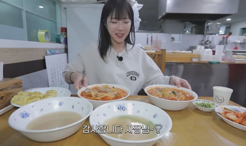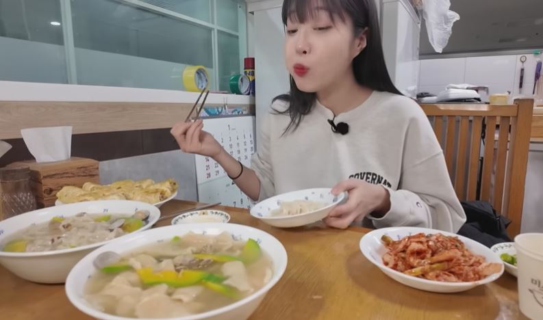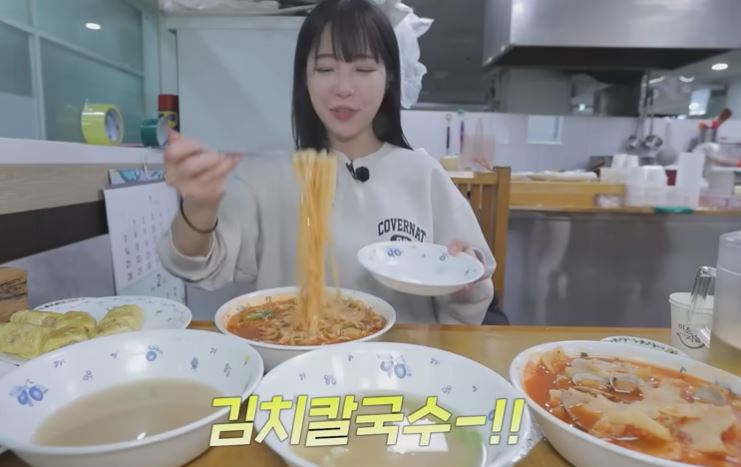 겨자소스와 나오고 쯔양은 그릇이 마음에 들었다고 하며 나온 음식의 국물 먼저 맛봅니다. 집에서 찐으로 할머니가 끓여주신 맛이라고 양도 많고 겉절이도 맛있고 칼국수에 후추도 뿌리고 김치와 함께 먹습니다.