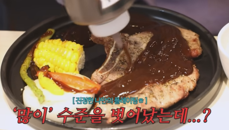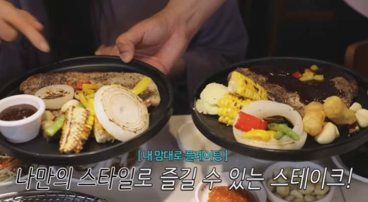 모닝빵으로 야채 넣고 고기 넣어서 햄버거로 만들어서 먹고 고기집에서 스테이크도 먹고 명륜진사갈비의 메인 숯불돼지갈비를 상추에 싸서 먹습니다.