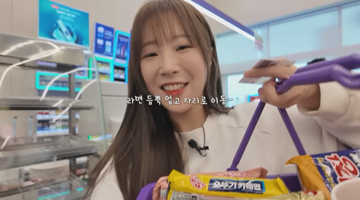 신라면, 미고랭, 팔도짜장면, 오뚜기카레면, 왕뚜껑 등 인기 라면들을 골라 담으며 행복한 고민🤭