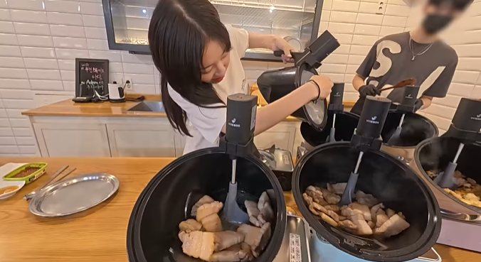 - “마음이 편안하다”는 쯔양 님의 감탄처럼 기름이 전혀 튀지 않고, 사람이 굽는 것보다 더 완벽하게 육즙을 지켜낸 삼겹살이 완성되었습니다.