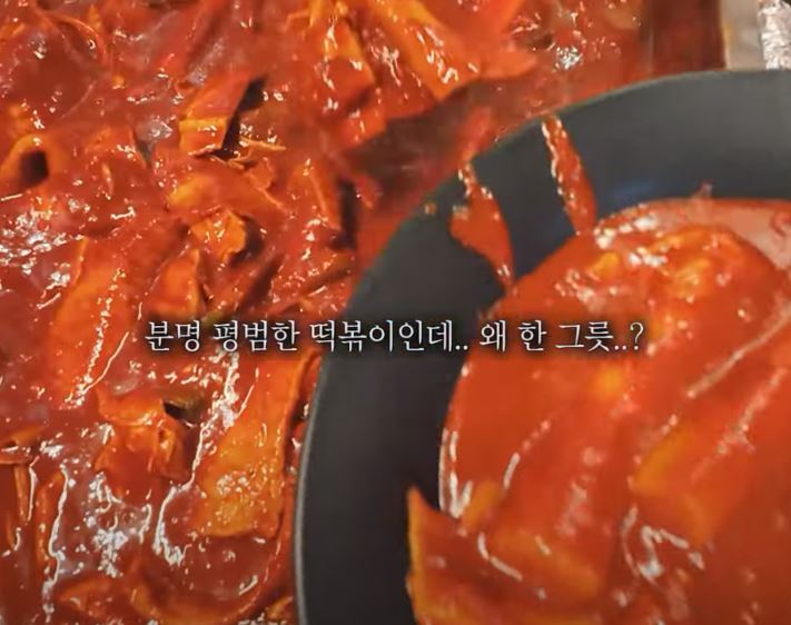 매운 떡 한 입을 먹고 예상보다 덜 매운 것 같아 맛있게 먹다가 놀랍니다.