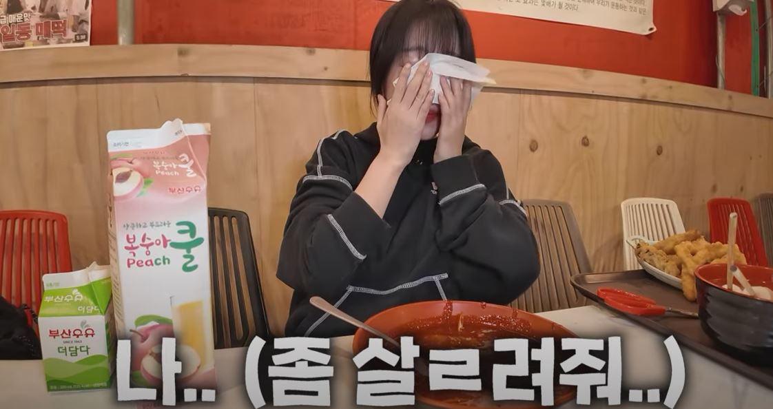 매운 걸 먹으면서 눈물을 흘리고, 우유를 마시며 힘들어하며 한 입씩 먹습니다.