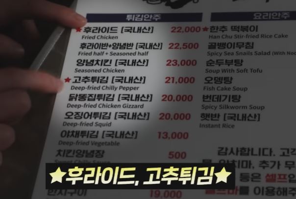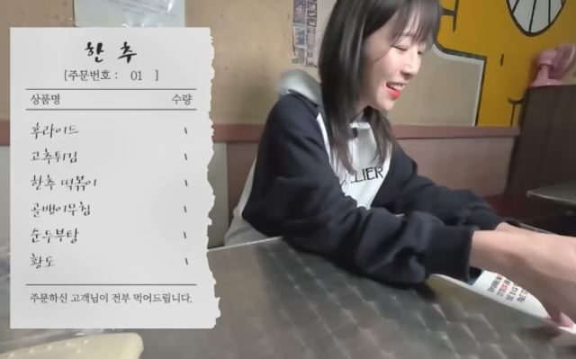 주문한 음식은 후라이드, 고추튀김, 한추떡볶이, 골뱅이무침, 번데기탕, 황도, 순두부탕으로 주문합니다.