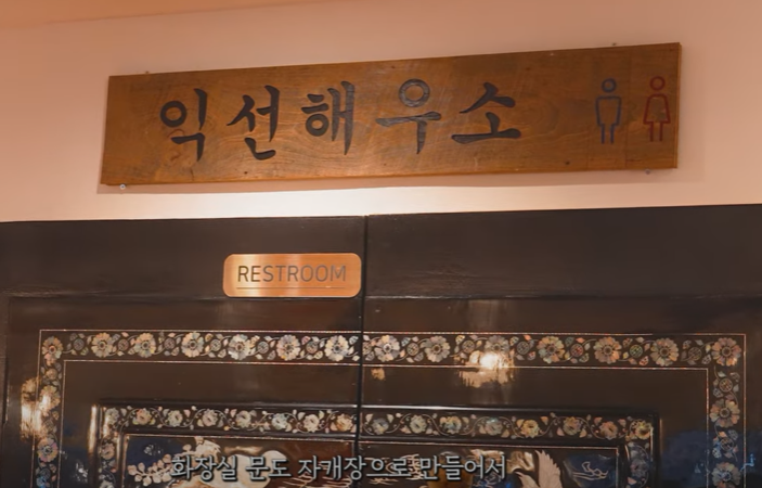 자개장 화장실 문: 화장실 문을 자개장으로 만들어 한국적인 느낌에 재미를 더했습니다.